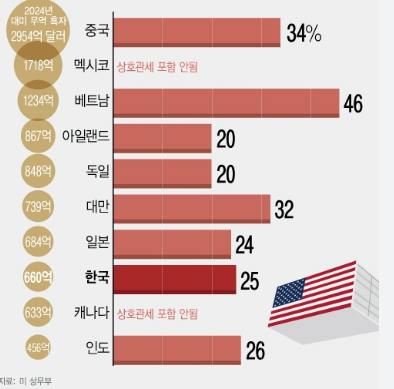 무역 의존도가 높은 국가군에 속한 한국은 FTA 체결국임에도 불구하고 미국과의 FTA 비체결국인 일본(24%)보다 높은 25%의 상호관세율이 적용됨에 따라 대미 무역은 물론 전체 무역에 상당한 충격파가 예상된다.