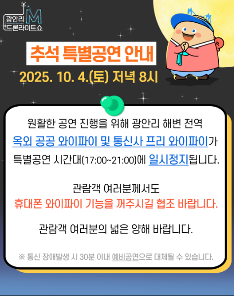 주의! 추석 특별 공연이나 대규모 행사가 있는 날에는 교통 통제 구간과 시간이 늘어날 수 있으니, 광안리 M 드론 라이트쇼 공식 홈페이지나 수영구청 공지사항을 꼭 확인하세요!