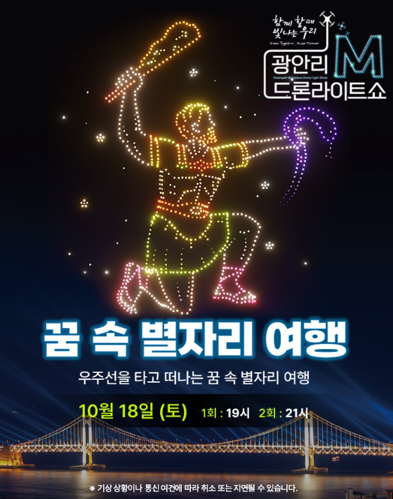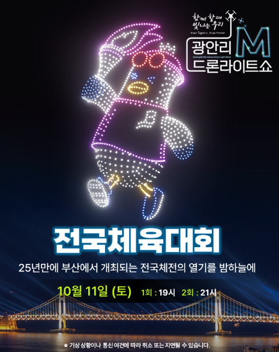 이번 추석 연휴에는 광안리 드론쇼가 더욱 특별하게 펼쳐집니다! 명절 분위기를 제대로 즐길 수 있는 특별 공연 정보는 다음과 같아요.