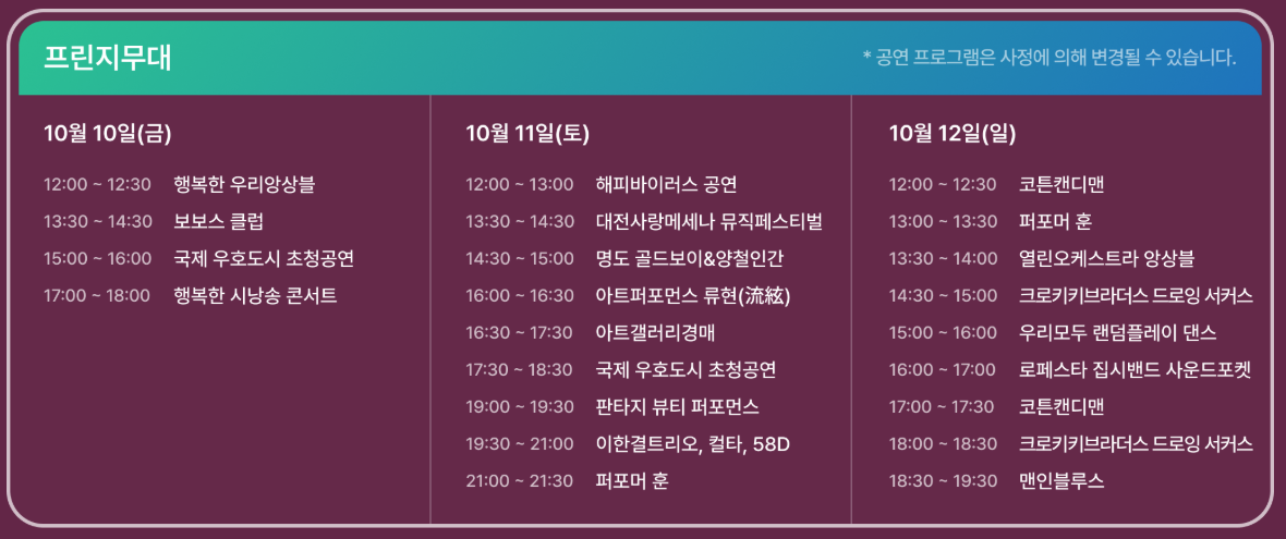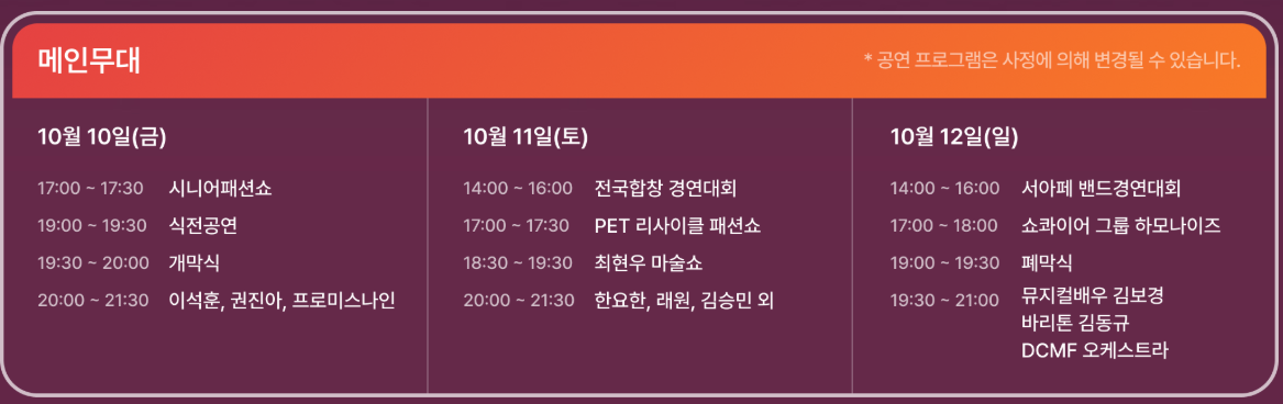 - 3일차 피날레 공연 (10월 12일 일요일 저녁):