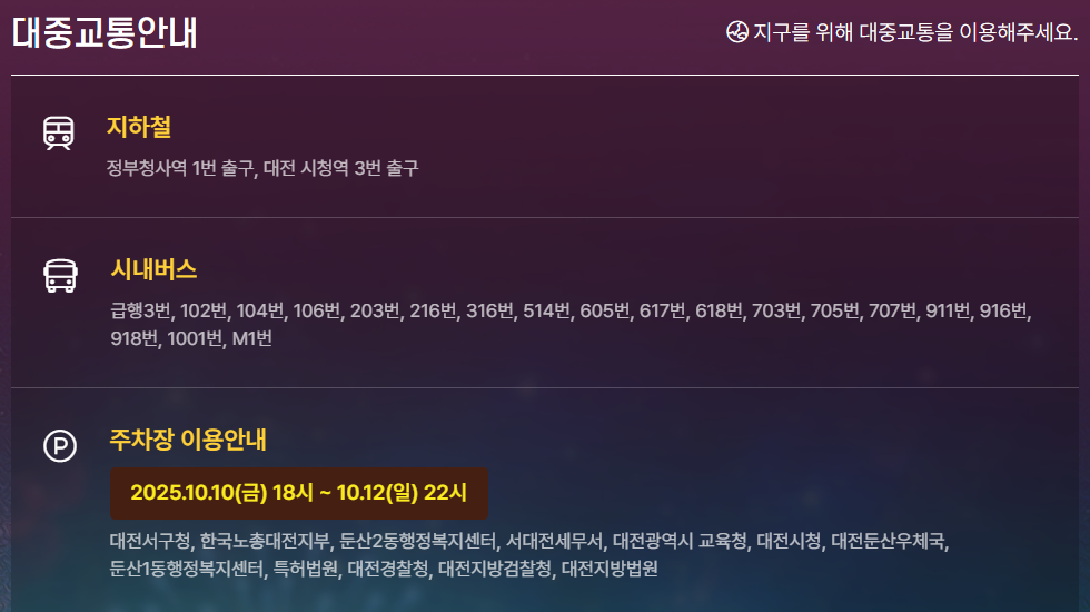 - 지하철: 대전 지하철 1호선 시청역에서 하차하면 축제장(서구청)까지 도보로 쉽게 이동할 수 있습니다.