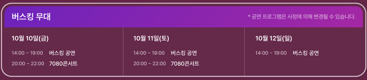 - 버스킹 무대 공연: 3일간 / 14:00 ~ 19:00