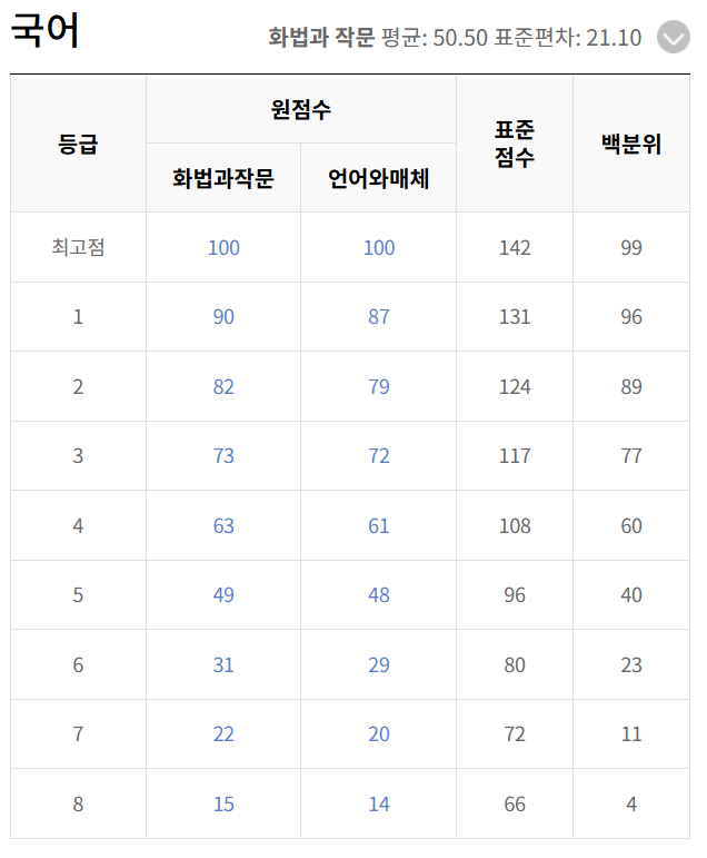 국어 | 화법과 작문 (화작) | 89점 ~ 90점 |