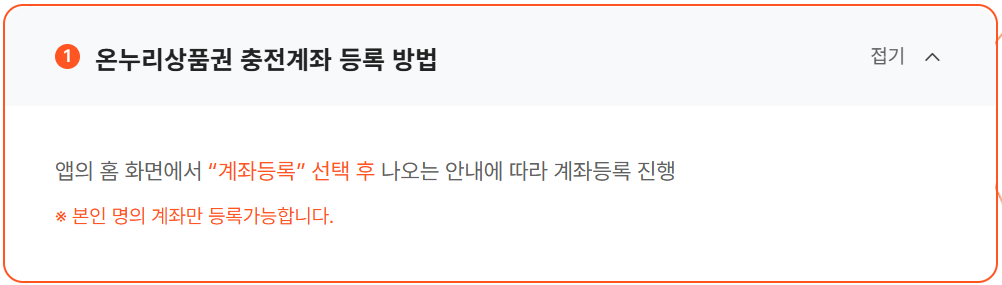 - 앱 홈 화면에서 **'충전계좌 관리'**를 선택하고, 상품권 충전에 사용할 본인 명의 계좌를 등록합니다. (최대 10개까지 가능)