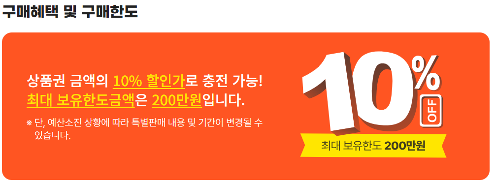 - 10% 상시 할인: 상품권을 충전(구매)할 때부터 이미 10% 할인된 금액으로 구매합니다. (예: 10만 원 충전 시 9만 원 결제!)