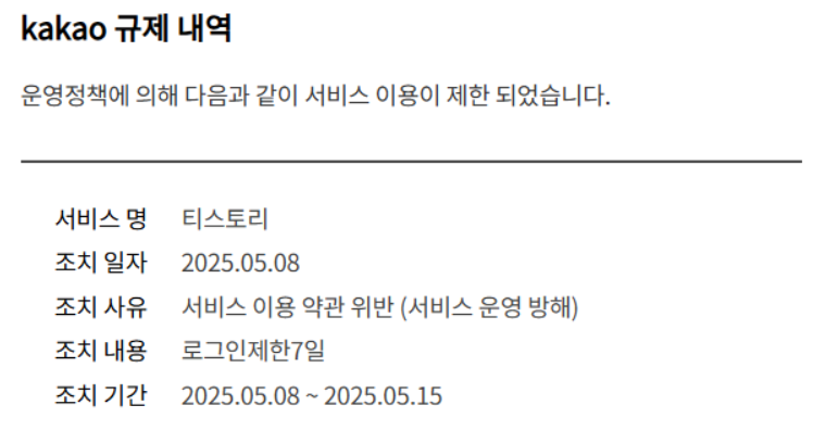 원인은 "서비스 이용 약관 위반" 라고 명시되어 있었습니다.