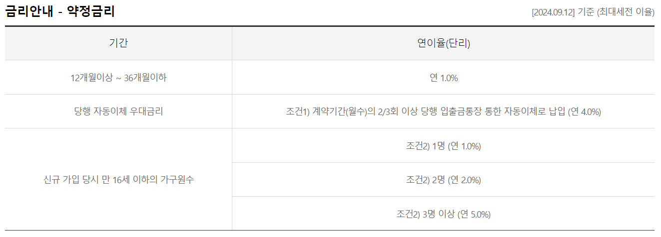 또한, 가구원 수에 따른 추가 우대금리도 제공됩니다. 예를 들어, 자녀가 3명인 경우 최대 연 10%의 금리를, 자녀가 2명인 경우 연 7%, 자녀가 1명인 경우 연 6%의 우대금리가 적용됩니다.