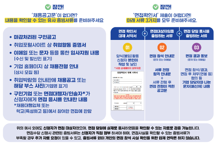 면접은 정규직뿐 아니라 계약직, 인턴십, 파트타임 등 다양한 형태의 고용형태에 대해 신청할 수 있으며, 기업, 공공기관, 비영리 단체 등 고용주와의 구체적인 면접 사실이 확인되어야 합니다.
