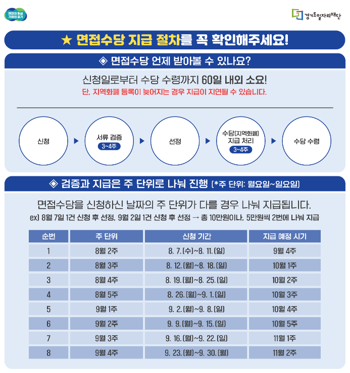 - 허위 신청 금지: 허위로 면접 사실을 제출하거나, 면접과 관련된 자료를 위조하여 신청하는 경우 법적인 제재를 받을 수 있으며, 지원금은 전액 환수됩니다. 경기도는 면접 확인서 등 제출 서류의 진위 여부를 확인하는 절차를 거치므로, 허위 신청은 불이익을 초래할 수 있습니다.