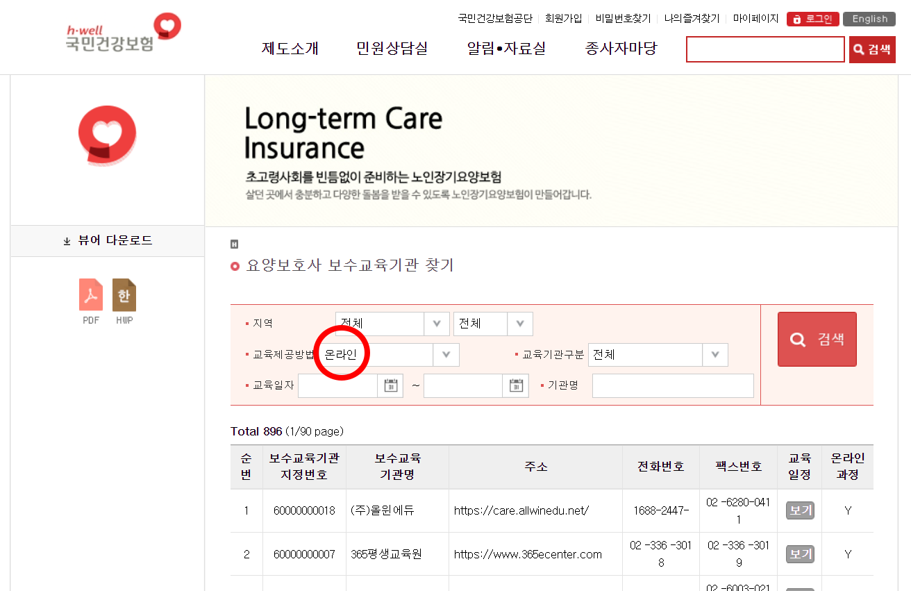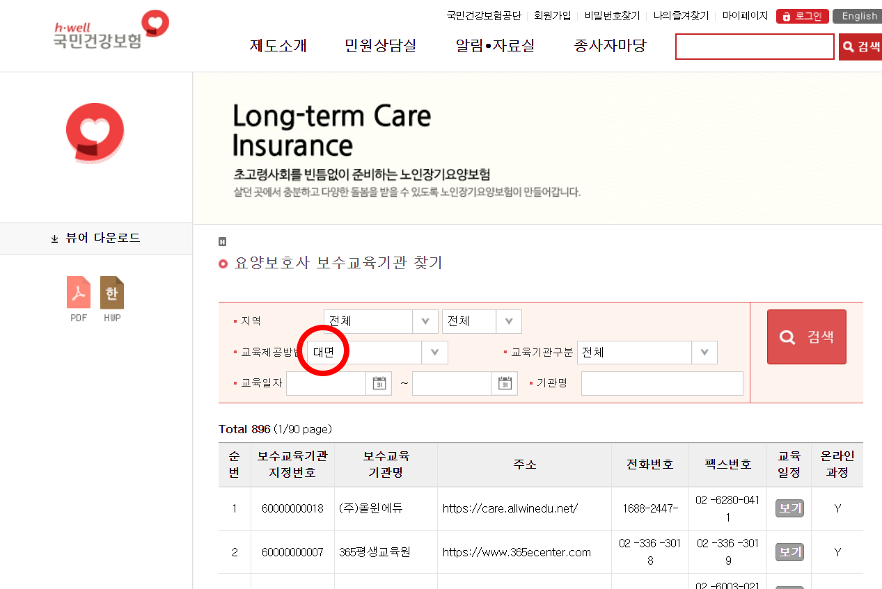 마찬가지로 대면(오프라인) 보수교육도 국민건강공단 공식 홈페이지에서 신청 가능합니다. 집 근처 교육기관을 찾아서 전화로 신청할 수 있으며 공단에서 지정한 인증 기관에서만 이수가 인정됩니다.