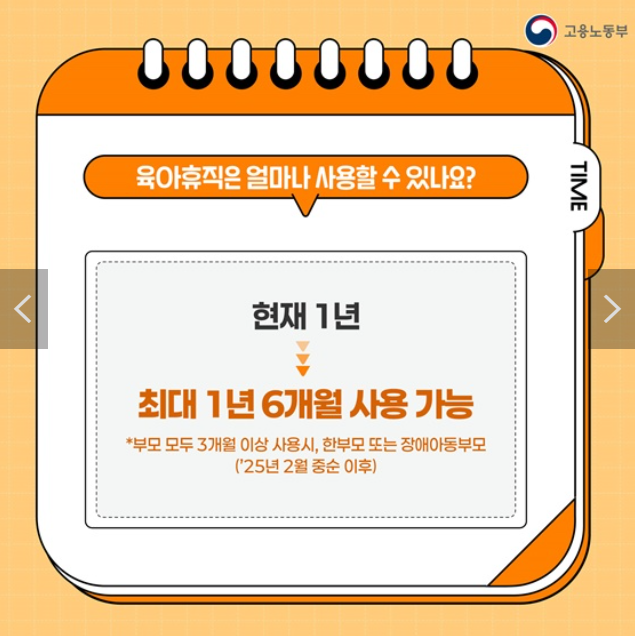육아휴직 기간 역시 2025년부터 연장됩니다. 기존의 육아휴직 기간은 자녀 1명당 최대 1년이었으나, 2025년부터는 자녀 1명당 최대 1년 6개월까지 사용할 수 있게 됩니다.