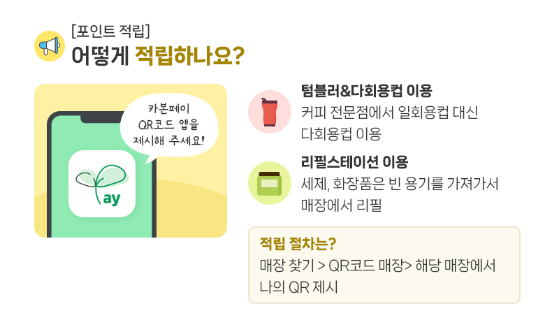 다회용품 사용: 일회용품 대신 다회용 컵, 식기 등을 사용하고 인증받으면 포인트가 적립됩니다. 예를 들어, 커피숍에서 텀블러를 사용하거나 포장 없이 상품을 구매하면 적립 대상이 됩니다.