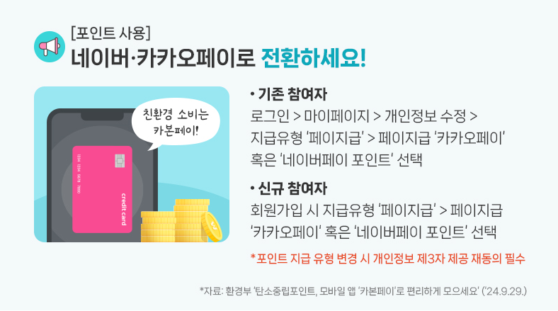 카본페이앱을 통해 적립된 포인트는 다양한 방식으로 사용할 수 있으며, 특히 네이버페이와 카카오페이로 전환하여 현금처럼 사용할 수 있습니다. 포인트를 이용해 친환경 소비를 하거나, 일상생활에서 현금처럼 쓸 수 있는 혜택을 누릴 수 있습니다.