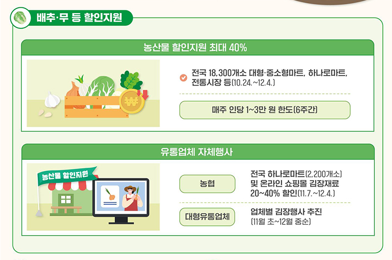 - 농협 : 전국 하나로마트(2,200개소) 및 온라인 쇼핑몰 김장재료 20~40% 할인(11.7.~12.4.)
