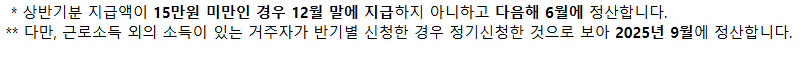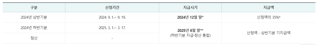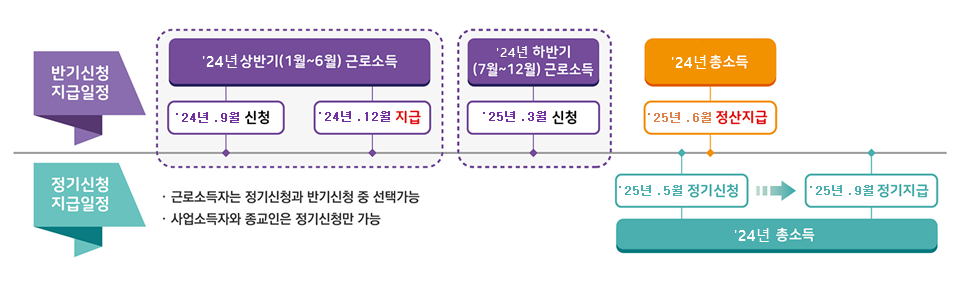 - 반기 지급: 상반기와 하반기로 나누어 6개월 단위로 신청이 가능하며, 상반기 소득분은 9월, 하반기 소득분은 다음 해 3월에 지급됩니다.