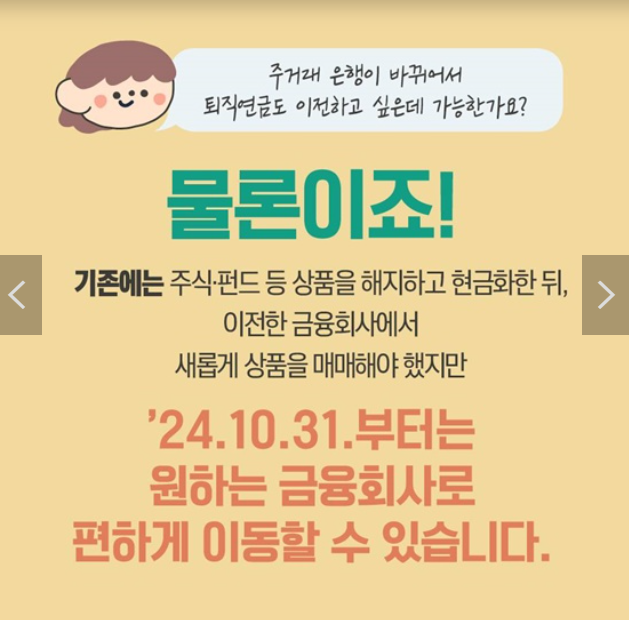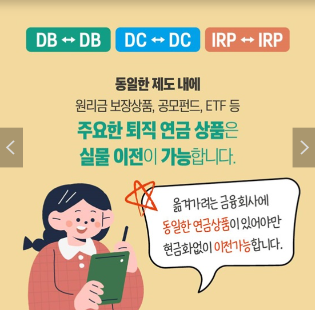 자세한 사항은 금융감독원 홈페이지 및 아래 "퇴직연금 실물이전 서비스" 파일을 참고하세요.