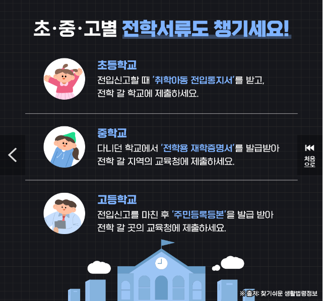 이사를 하면서 학령기 자녀가 있는 가정은 전학 절차도 중요한 부분입니다. 거주지 변경으로 인해 아이가 다니는 학교를 옮겨야 할 경우, 전학 절차와 서류 준비가 필요합니다.