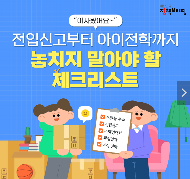 오늘은 주거이전 우편물 전송 서비스에서부터 전입신고, 확정일자 신청, 주택임대차 계약 신고, 전학 절차까지, 이사를 위해 필요한 체크리스트를 단계별로 소개합니다.