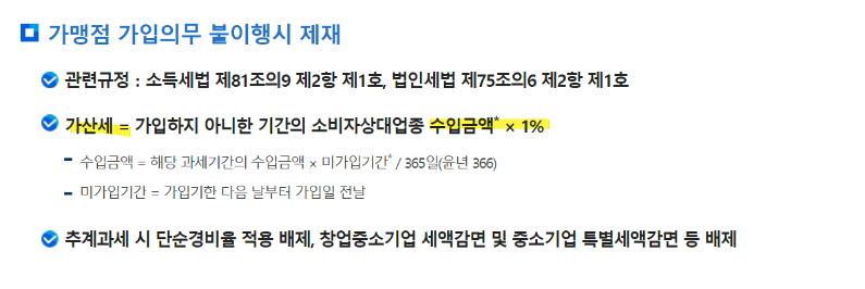 미가입 가산세: 현금영수증 발급 의무가 있음에도 가맹점에 가입하지 않거나 의무를 이행하지 않은 경우 일정 금액의 가산세가 부과됩니다.