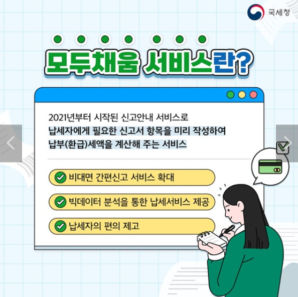모두채움 서비스는 국세청에서 2021년 도입한 비대면 세금 신고 안내 서비스로, 납세자가 신고해야 할 필수 항목들을 국세청에서 미리 작성해 제공합니다. 이를 통해 납세자는 필요한 항목들을 별도로 계산하지 않고도 세액 확인과 신고를 간편하게 할 수 있습니다.