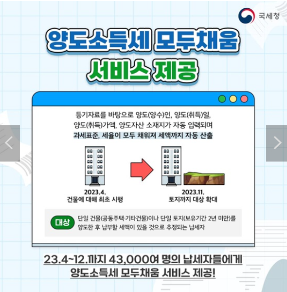 : 2023년 4월부터 12월까지 약 43,000여 명의 납세자가 이 서비스를 통해 양도소득세 신고를 간소화할 수 있습니다.