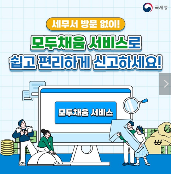 모두채움 서비스는 복잡한 세금 신고 과정을 간편하게 처리할 수 있도록 돕는 서비스로, 납세자가 세무서를 방문하지 않고도 온라인에서 쉽게 신고할 수 있게 설계된 비대면 납세 지원 시스템입니다.
