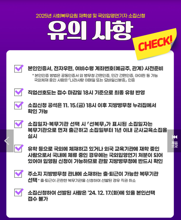 사회복무요원 소집 신청 대상자는 병무청의 안내에 따라 신중히 신청 절차를 진행하고, 결과 발표 후 소집 일정에 맞춰 준비하는 것이 중요합니다.