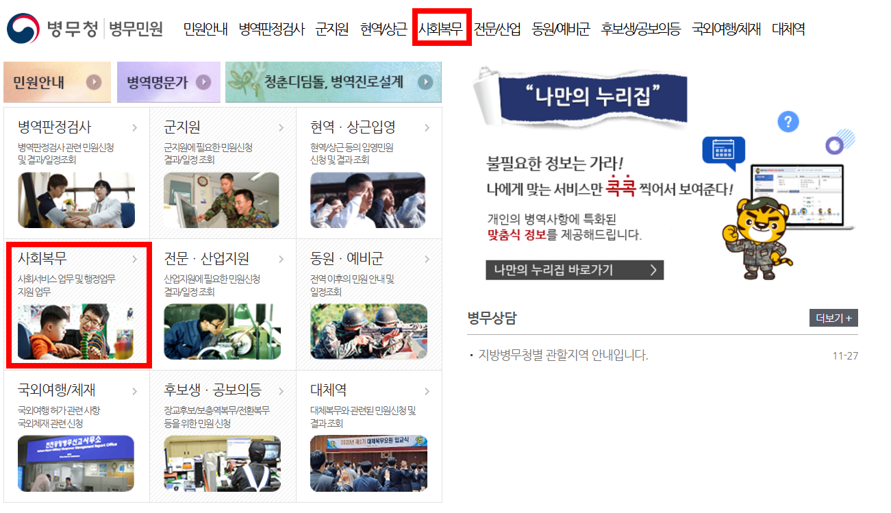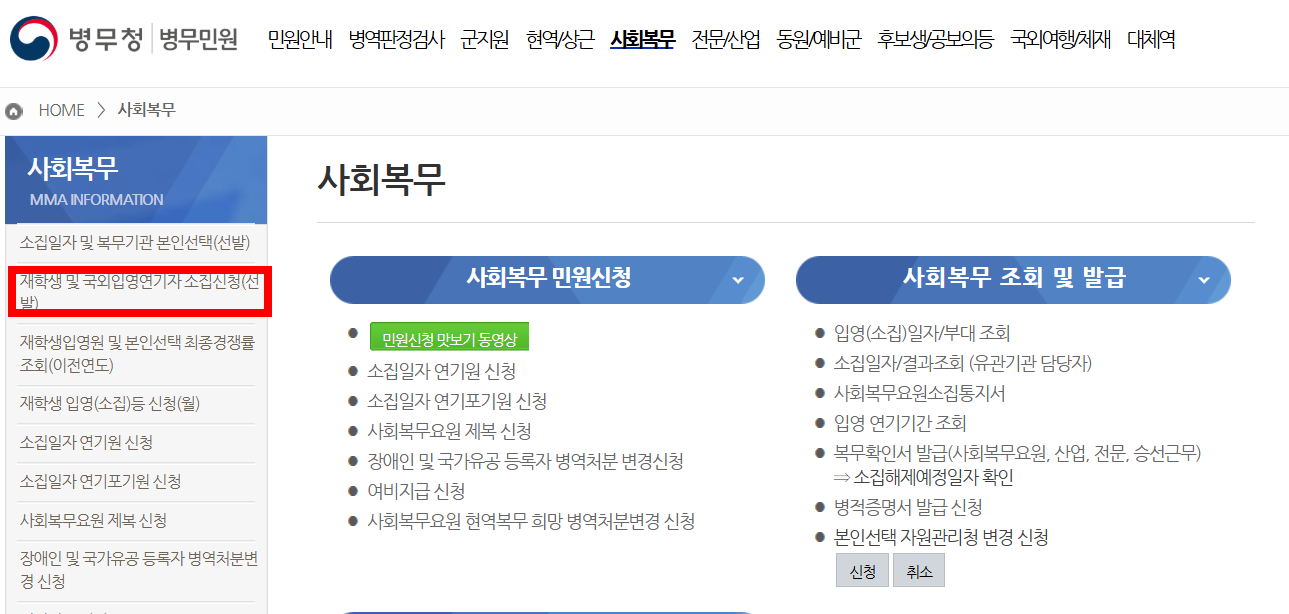 병무청 누리집 접속 → 병무민원 → 사회복무 → ‘입영(소집)일자/부대’ 항목 선택.