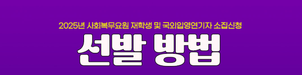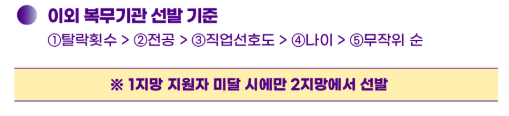 사회복무요원 선발 기준을 부여하여 전산을 통하여 선발합니다. 전공/직업 선호도를 반영하여 선발하는 기관의 선발기준과 이외 복무기관 선발기준이 있습니다. 각 기준에 따른 방법은 아래에 자세히 설명되어 있습니다.