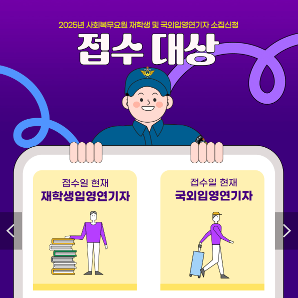 아래에서 접수 대상, 신청 방법, 접수 기간과 결과 발표 일정에 그리고 사회복무요원 복무기간 및 월급에 대해 자세히 안내해 드리겠습니다.