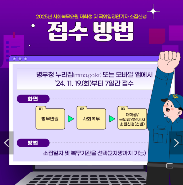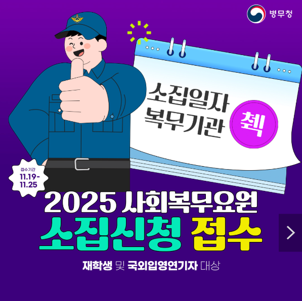 2025년도 사회복무요원 소집 신청 접수가 시작됩니다. 이번 소집 신청은 대학 재학생 및 국외에서 입영이 연기된 사람들을 대상으로 한 첫 번째 접수로, 사회복무요원 소집 신청을 희망하는 이들에게 중요한 기회입니다.