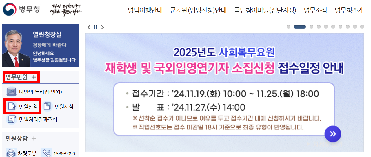 병무청 누리집에 접속하여 ‘병무민원’ 메뉴에서 ‘사회복무’ → ‘입영(소집) 신청’으로 이동합니다.