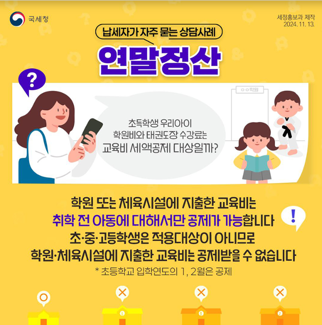학원 및 체육시설 관련 교육비는 취학 전 아동(유치원생 등)만 공제가 가능하며, 초·중·고등학생은 해당되지 않습니다.