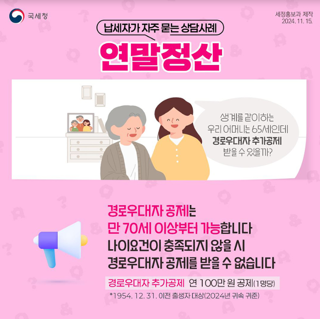 4. 경로우대자 추가공제는 만 70세 이상(출생연도 1954년 12월 31일 이전)이어야 적용받을 수 있습니다.