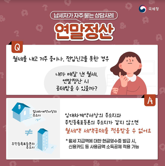 2. 월세 세액공제는 임대차계약서와 주민등록표 주소가 일치해야 하며, 현금영수증 발급 시 신용카드 소득공제로 일부 혜택 가능.