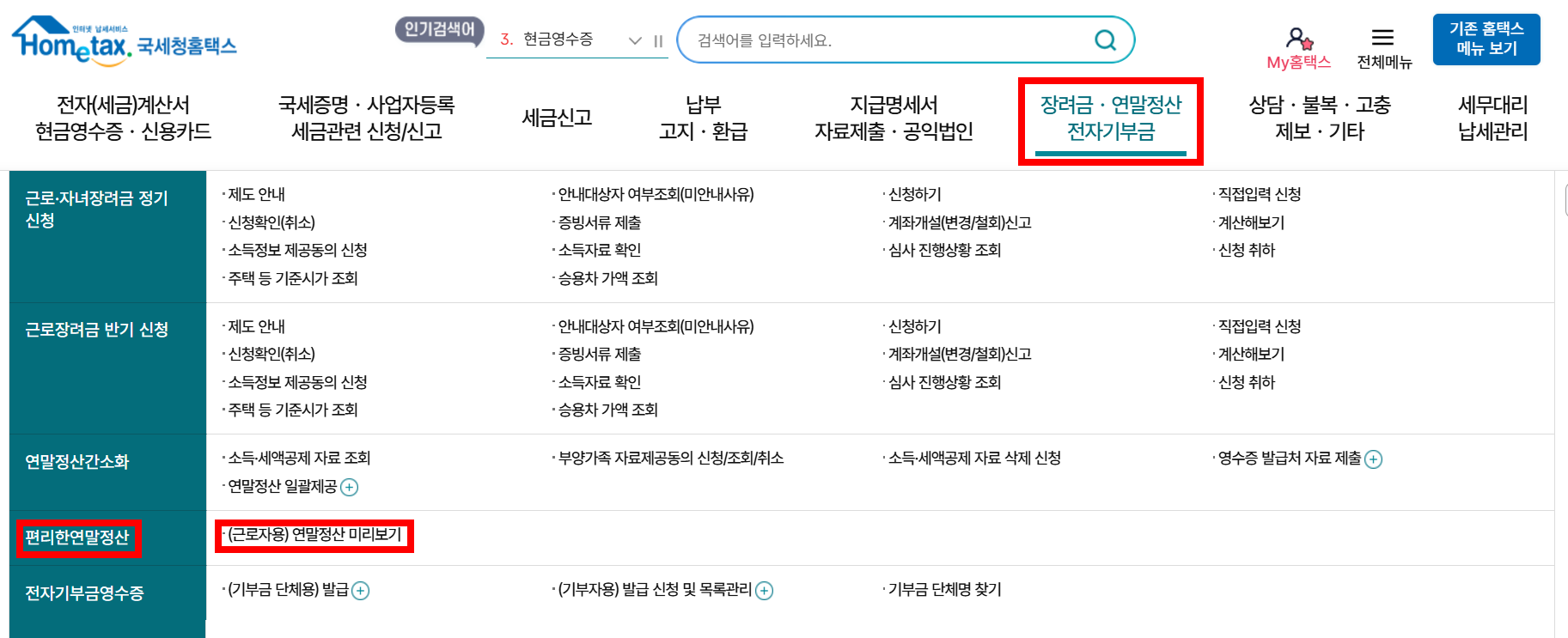 ※ 국세청홈텍스 > 장려금.연말정산 전자기부금 > 편리한 연말정산 > (근로장용)연말정산미리보기