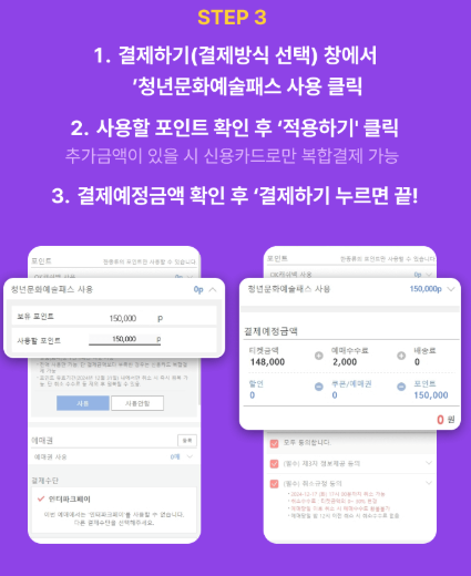 STEP3. 결제하기 창에서 '청년문화예술패스' 사용 클릭 > 사용할 포인트 확인 후 '적용하기' 클릭 > 결제예정금액 확인 후 '결제하기' 누르기