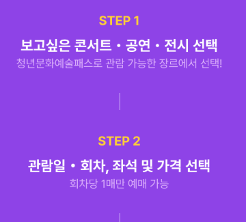 STEP1. 보고싶은 콘서트. 공연. 전시 선택 (청년문화에술패스로 관림 가능한 장르에서 선택!)