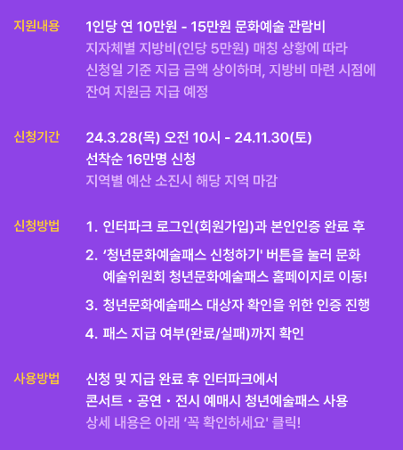 - 신청 후 배정된 지원금은 바로 사용할 수 있으니, 빠르게 자신이 원하는 공연이나 전시를 예매하는 것이 좋습니다.
