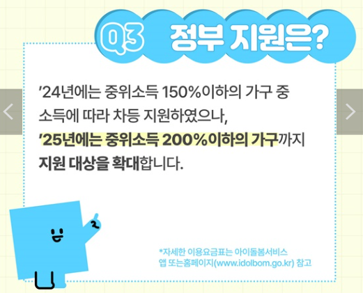 정부는 가정의 소득 기준 중위소득에 따라 돌봄 서비스 비용의 일부를 지원합니다. 이는 4단계로 나뉘며, 소득이 낮을수록 높은 지원율을 받습니다.