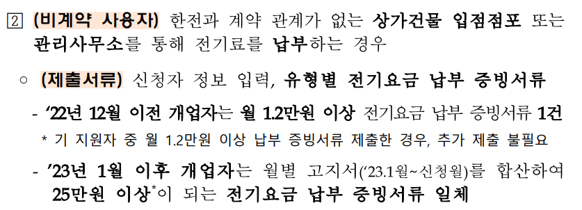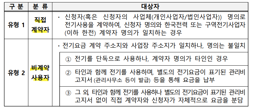 소상공인 전기요금 특별지원 계약자 유형별 (직접 계약자, 비계약 사용자) 별로 필요한 서류는 다음과 같습니다.
