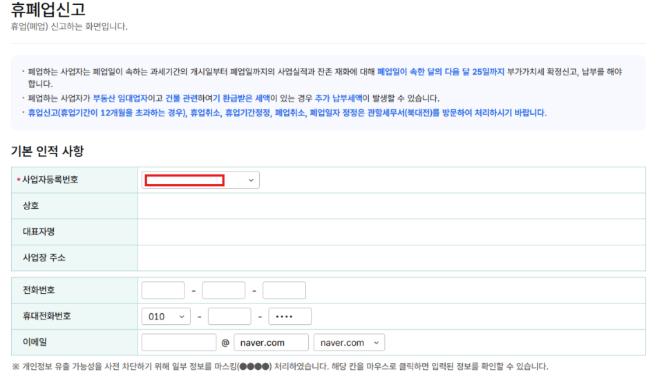 사업자 정보를 입력하고 폐업일, 사유 등을 기재합니다.