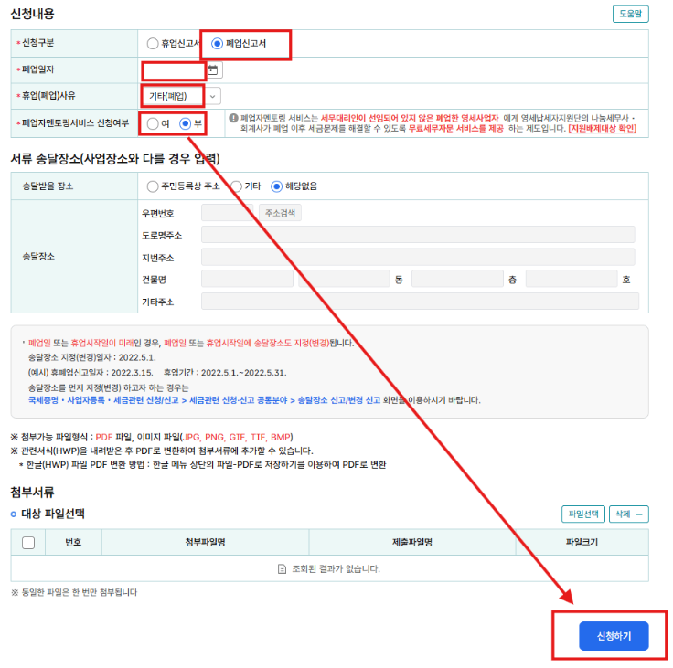 폐업 신고서와 함께 필수 서류를 첨부하여 제출합니다.