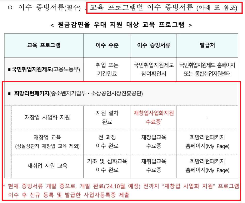 - 희망리턴패키지 수료증 또는 대체 서류(재창업 사업화 과정 참여자의 경우 사업자등록증).