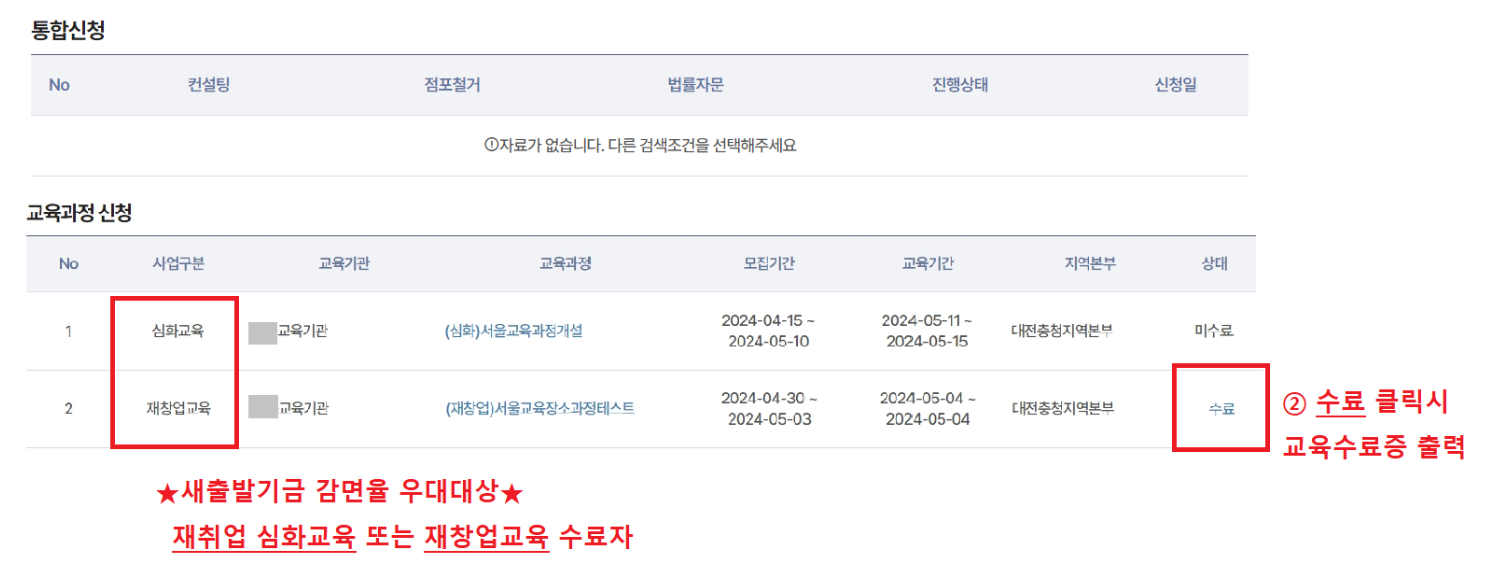 ※ 단, 재취업 기초교육(e러닝) 및 성실상환자 재창업 교육(e러닝) 수료자는 대상에서 제외됩니다.