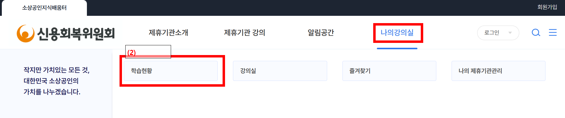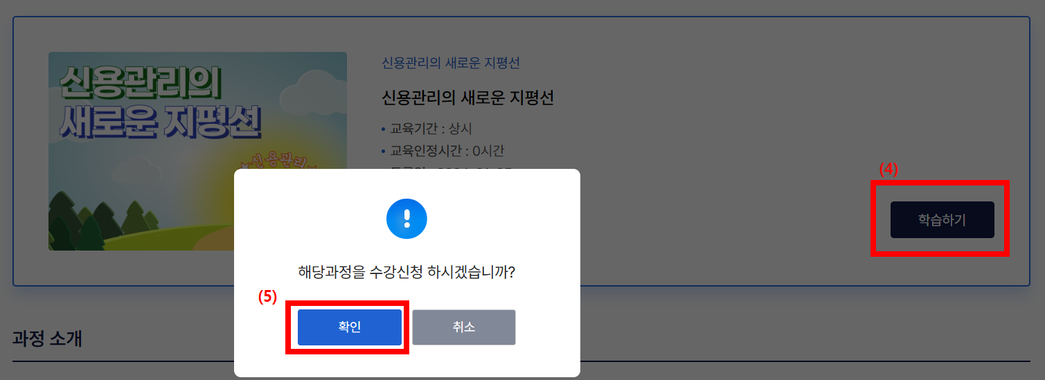 - 이수한 강의 목록에서 신용관리교육 수료 여부를 확인합니다.