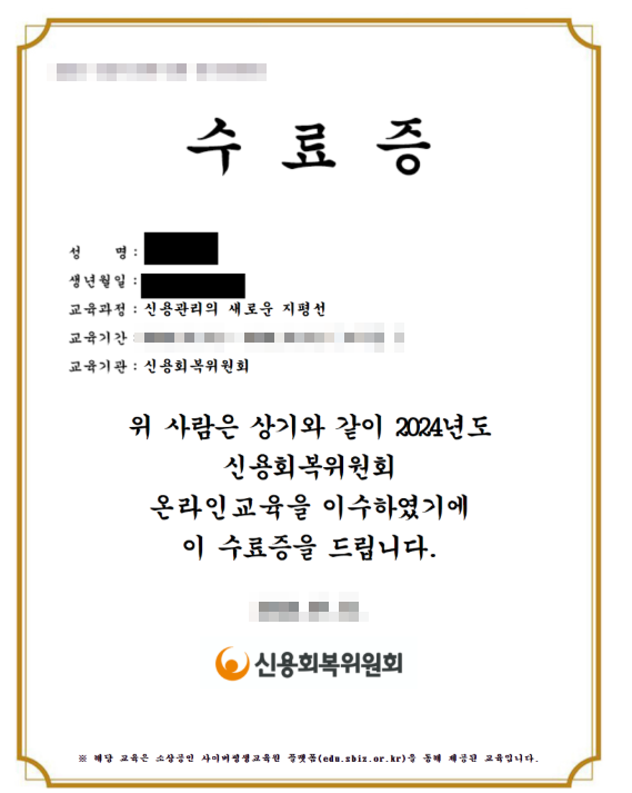 신용관리교육을 완료하면 수료증이 발급되며, 이는 다양한 정부 지원 프로그램이나 재기 관련 사업에서 중요한 증빙 자료로 활용될 수 있습니다.